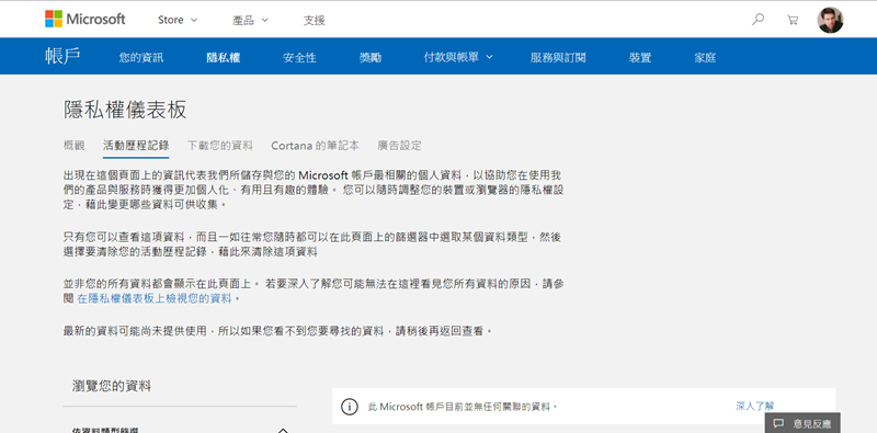 儀表板查看,包括收集的數據類型,例如位置、搜索結果和瀏覽紀錄,阿湯是一開始就有設定所以沒什麼資料,如果沒有去理它的話這裡應該蠻精彩的。