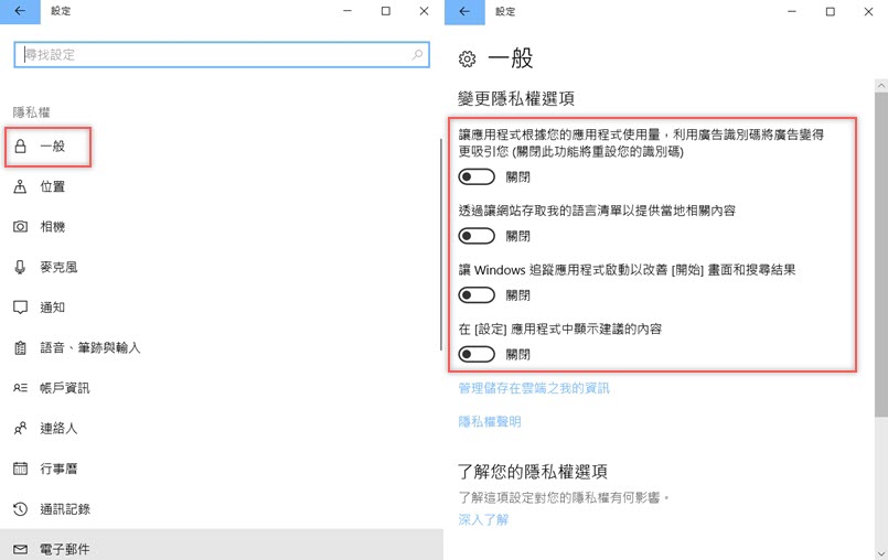 再來是隱私權設定中的「一般」,裡面的「變更隱私權選項」建議通通關閉,尤其是第一項,應用程式會根據你的使用量,利用廣告識別碼讓廣告更吸引您,例如常看色情網站系統可能就會用養眼圖片轟炸你,如果有其他人用你電腦就尷尬了。