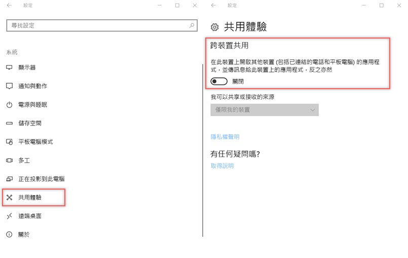 最後是系統設定中的「共用體驗」,你可能會使用不同設備來登入應用程式,從隱私的角度來看,最好關閉,因為它代表微軟可能會在不同設備間收集與分析你的資料,有需要的話等應用程式跳出視窗、詢問你要不要打開的時候再處理就好。