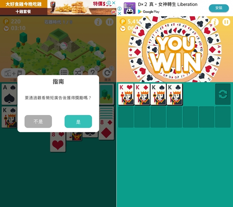 像阿湯就沒耐心按太多次洗牌很快就用完了,只好不斷看影片來取得次數,有玩過接龍的就會知道有時候破關很快,有時候就沒那麼順利卡關卡超久,當然你快破的時候會提示你可以自動完成,紙牌就啪啪啪自己上去了。