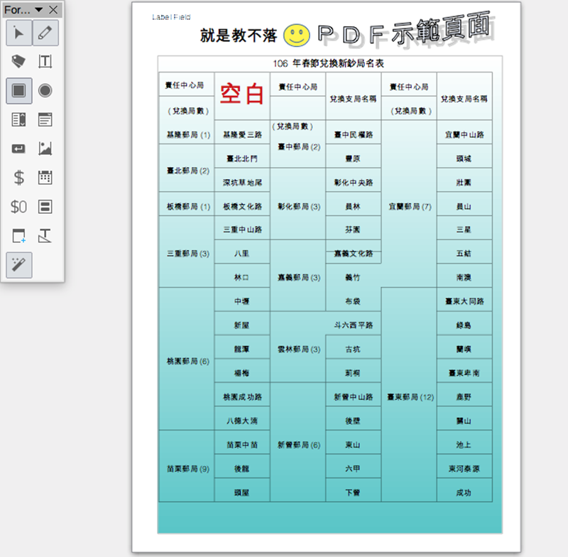 倒三角形點開裡面就是所有項目的名稱,包括標籤以及各種形狀的選取框格及按鈕,還可以畫出日期、金額相關的功能區塊。