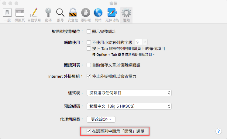 到進階,勾選最底下「在選單列顯示開發選單」。