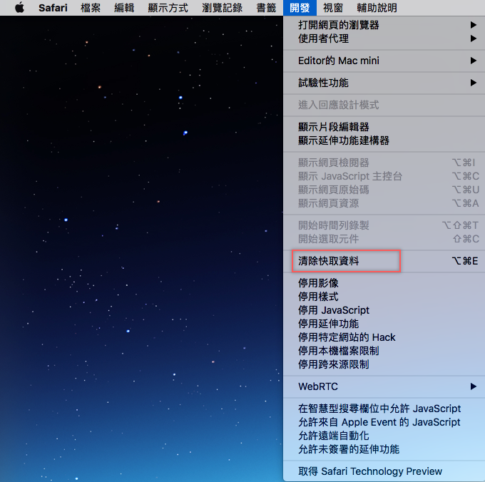 跳出後就會在最上面看到開發這項,打開後找到「清除快取資料」,點下去就會開始清除了。