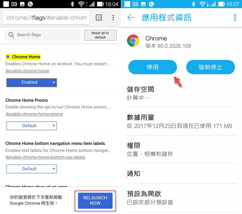 接下來示範怎麼將網址列移到最下方,先輸入「chrome://flags/#enable-chrome-home」,找到「Chrome Home」之後點 Enabled,這邊需要重新啟動兩次,第二次要進入應用程式將 Chrome 停用。