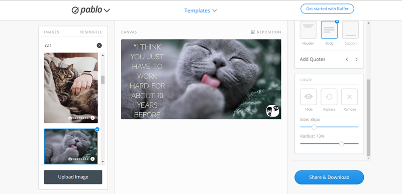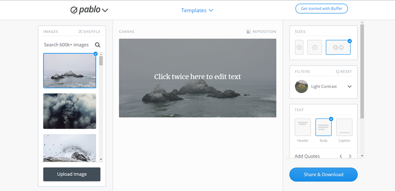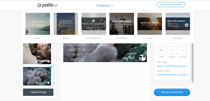 FB 粉絲團小編常用工具懶人包,或是「Pablo by Buffer」這個網站,支援國外各大圖庫,600 萬以上不同樣式相片任選,還可以加上濾鏡、文字、置入 LOGO,相信大家都能做出好看的 FB 封面。