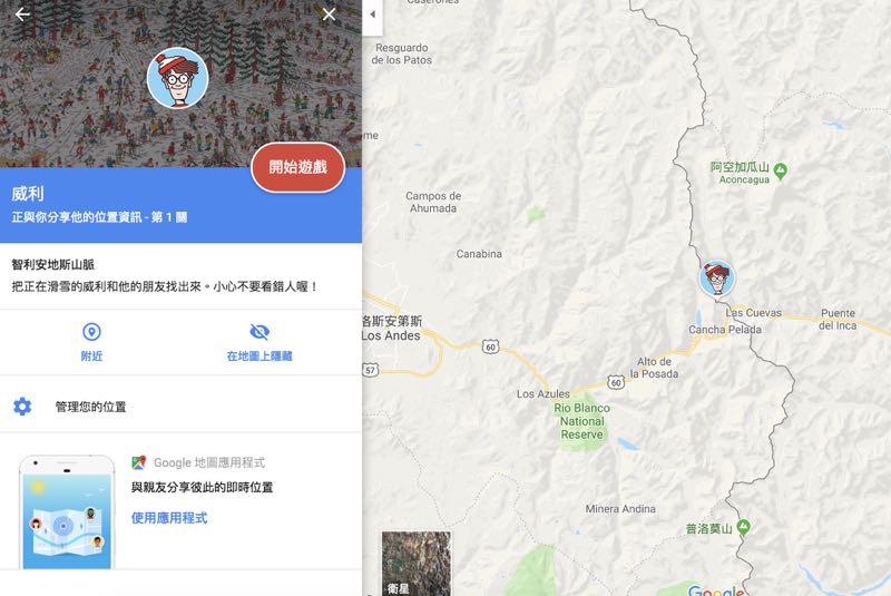 當點選 Google Maps 的威利身影後就會出現他所隱身的城市,我們可以透過對地圖的上下左右拖曳與 “+”、“-” 縮放開始尋找威利的身影。