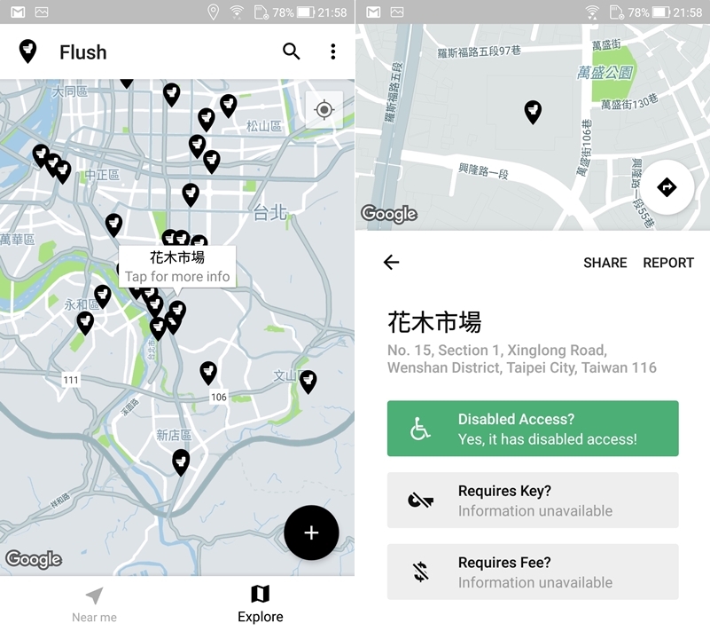 阿湯看了一下台灣的資料以台北最多,桃園、新竹、台中、台南、高雄等城市次之,有時候看地圖沒顯示,放大才會跳出來,像下圖是台北興隆路的花木市場,有無障礙設施,鑰匙和費用沒有資料(應該是不需要?),還可連結 Google 地圖導航。