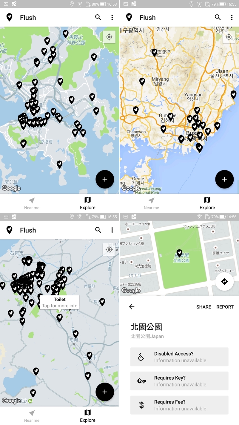 不過在台灣其實加油站和部分便利商店都有廁所,算是如廁很方便的地區,所以阿湯再找了好幾個國家,發現這款 APP 收集的國外資訊似乎比台灣豐富,例如香港、韓國、日本北海道,放大地圖看會更清楚。