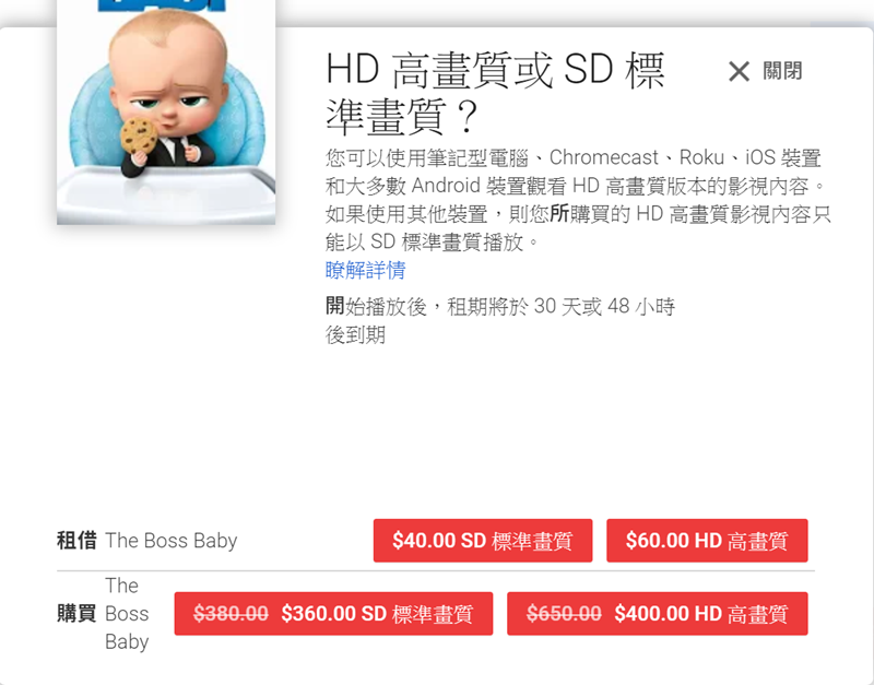 除了可單片租借之外還能直接買斷,以畫質來區分費用,大家可依需求或使用平台,來選擇標準 SD 或 HD 高畫質,使用天數也不一樣。
