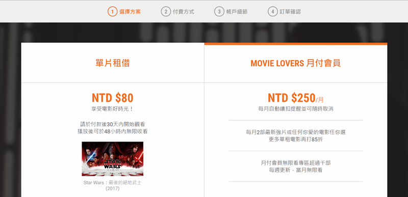 使用方案有單片租借或月付會員,如果是像現在假日才想找部片來看就選單片吧,付款後 30 天內可選擇開始觀看,但播放後 48 小時內就要看完,次數無限。