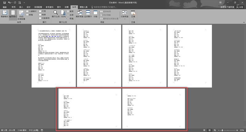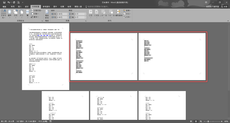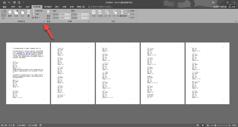 接下來要以六頁的文件做示範,阿湯先全部縮小方便檢視,然後到版面配置頁籤,點開版面設定底下那個小箭頭。