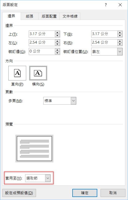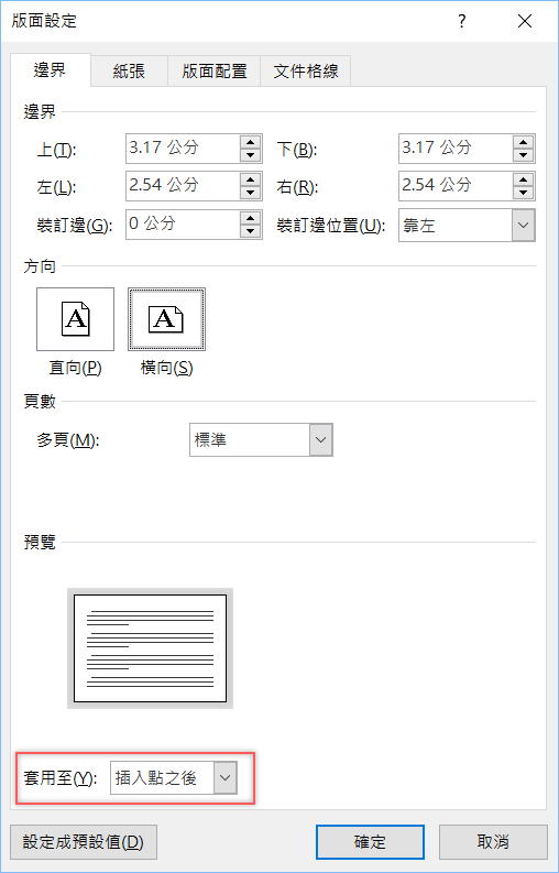 因為在這之前阿湯有先將滑鼠游標移到要更改方向的地方,所以只要在這裡選擇「橫向」,然後將套用至切換為「插入點之後」。