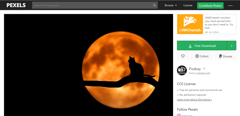 像這個月亮背景的貓剪影,有說明是 CC0 授權不須提供歸因,底下還有相關圖片、標籤、像素、拍攝時間、色票,以及使用相機和焦距、感光度等,蠻詳細的。