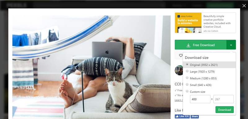 不是每張提供的大小選項都一樣,像這張貓咪與人的生活照原始尺寸就有3932*2621,都是點選就直接下載,不用註冊也不用其他程序。