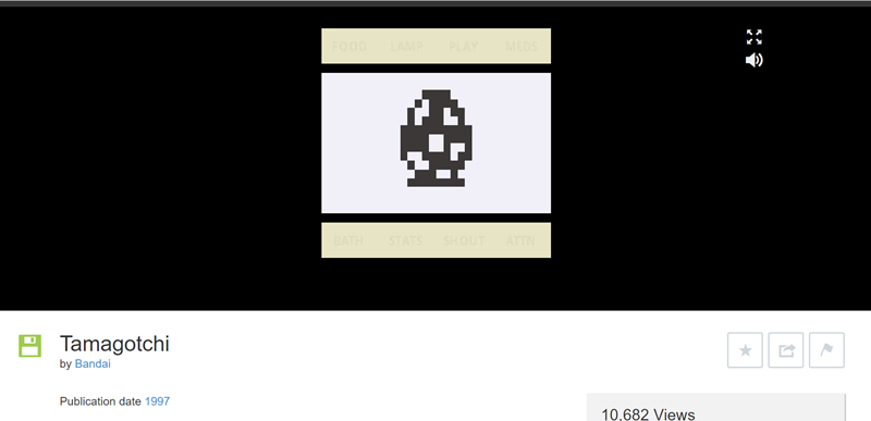 我永遠的塔麻可吉」的電子雞,在這裡面算蠻新的遊戲,由日本人發明並於 1997 年推行至世界,距今已經 20 年了,底下除了簡介之外,還提供當時的使用說明書,想要玩的話,點圖片上的開關就會下載數據並啟動。