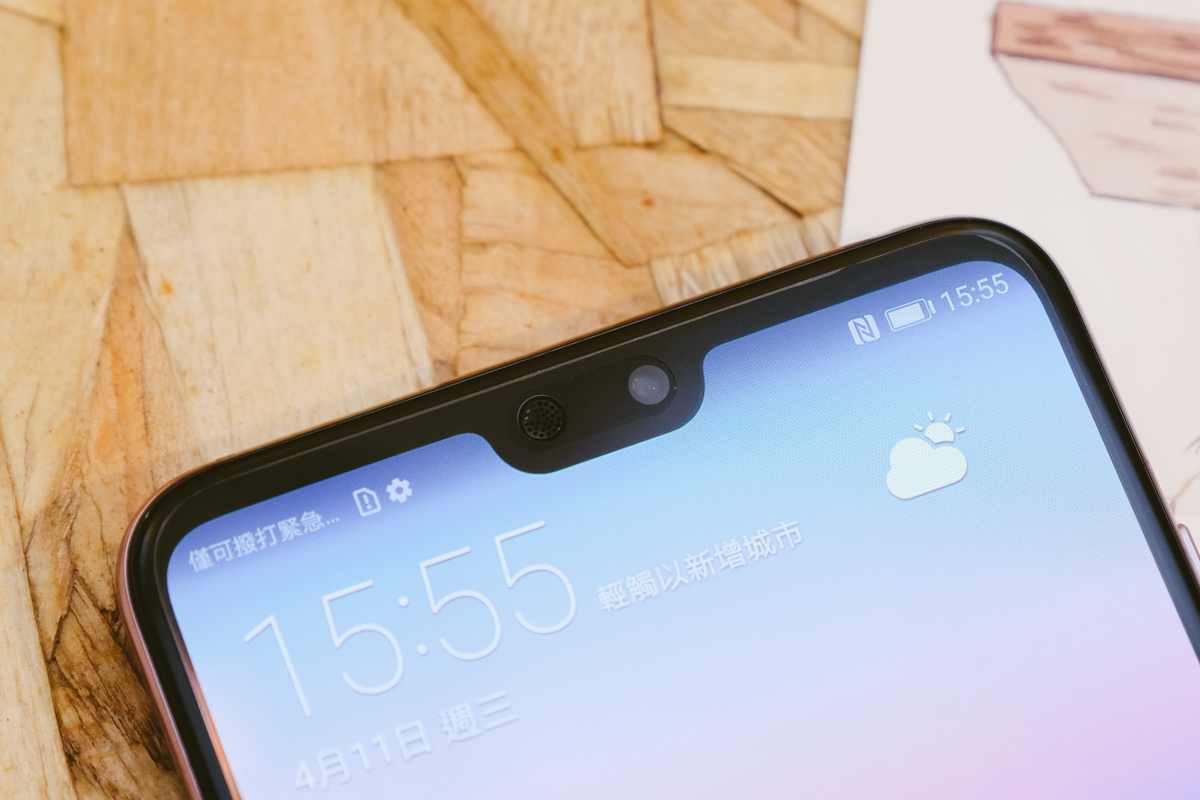 先來看看上方,為了讓螢幕頂部邊框再更往內縮,這次採用了與 iPhone X 一樣的瀏海設計,不過!這瀏海可不是像 iPhone X 長長的一條,除了喇叭孔與前置鏡頭必須的空間外,基本上只有短短的一條瀏海,相較於 iPhone X 的設計,這樣可以在通知欄上看到更多的圖示,運用起來是更加便利的。