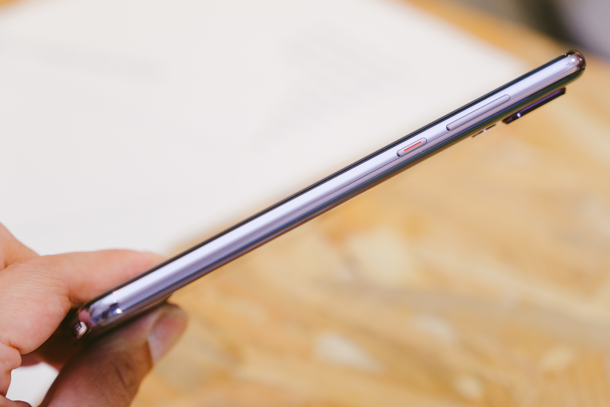 頂部為紅外線感應器及降噪麥克風,這次的極光色邊框是採用帶著淺紫色的金屬材質,一開始阿湯在拍攝時還以為外是環境反光造成的,原來不是啊!
