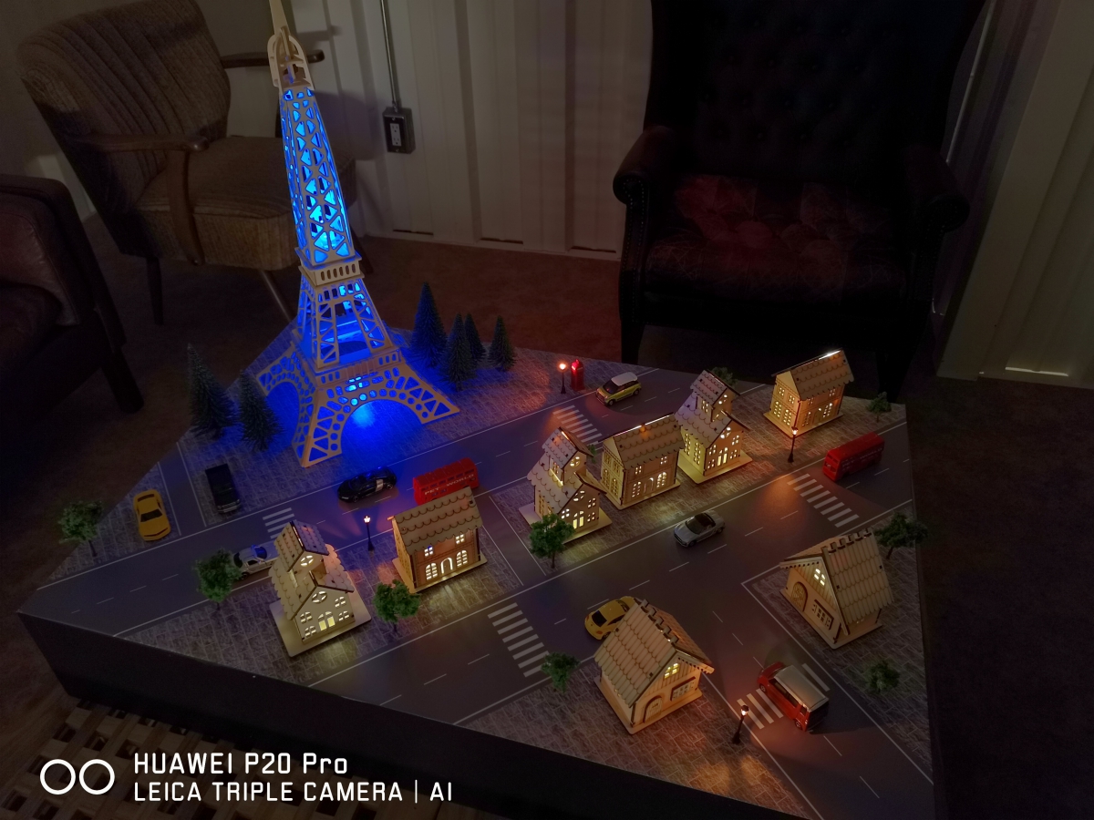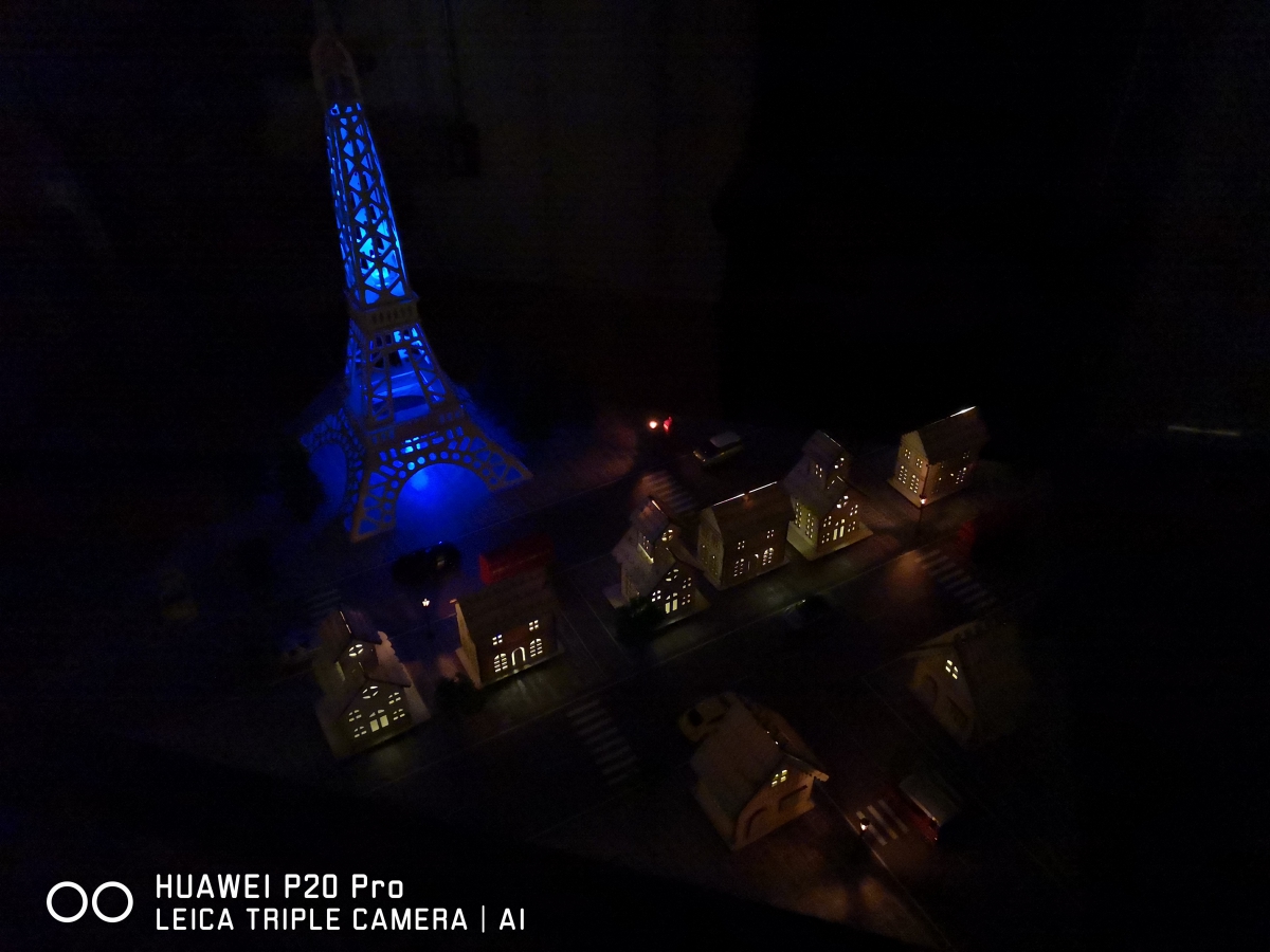 首先這是在一間全暗的房間內只有這些建築模型有微光,第一張照片是使用一般自動模式所拍攝,可以看到除了微光的部份外,什麼都沒有。
