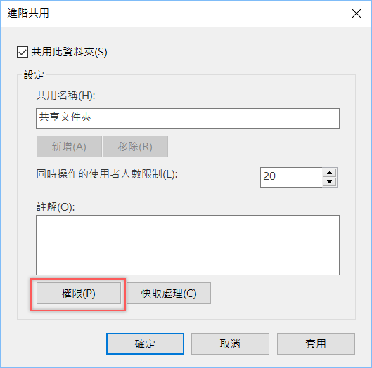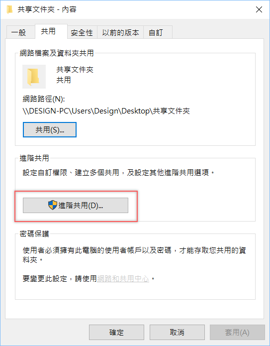 先在 Windows 10 這端,進到資料夾內容,選擇共用 → 進階共用。