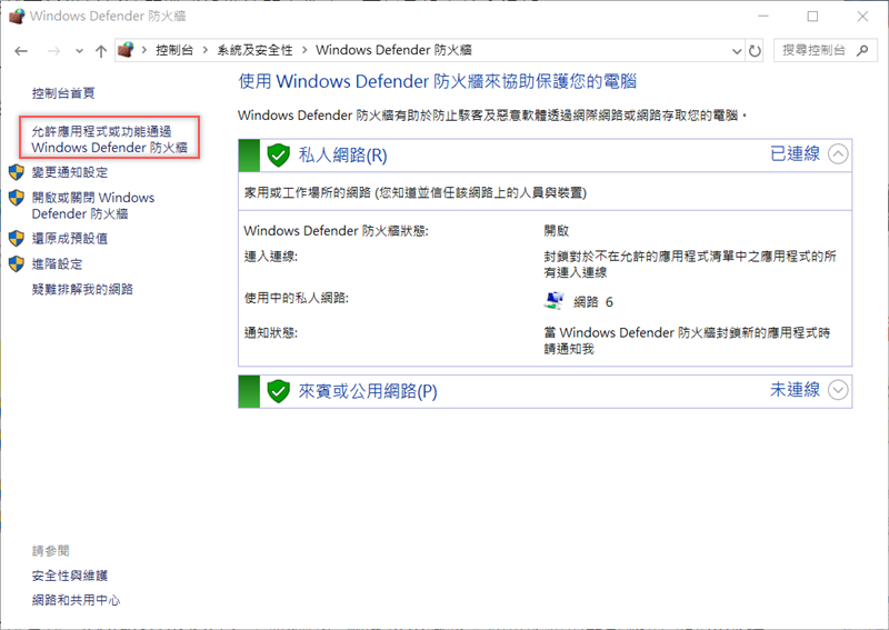 再來還要設定防火牆,進入控制台系統及安全性 Windows Defender 防火牆,左邊的「允許應用程式或功能通過防火牆」。