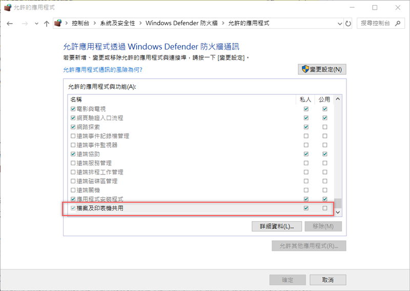 然後找到「檔案及印表機共用」,勾選私人後儲存設定。
