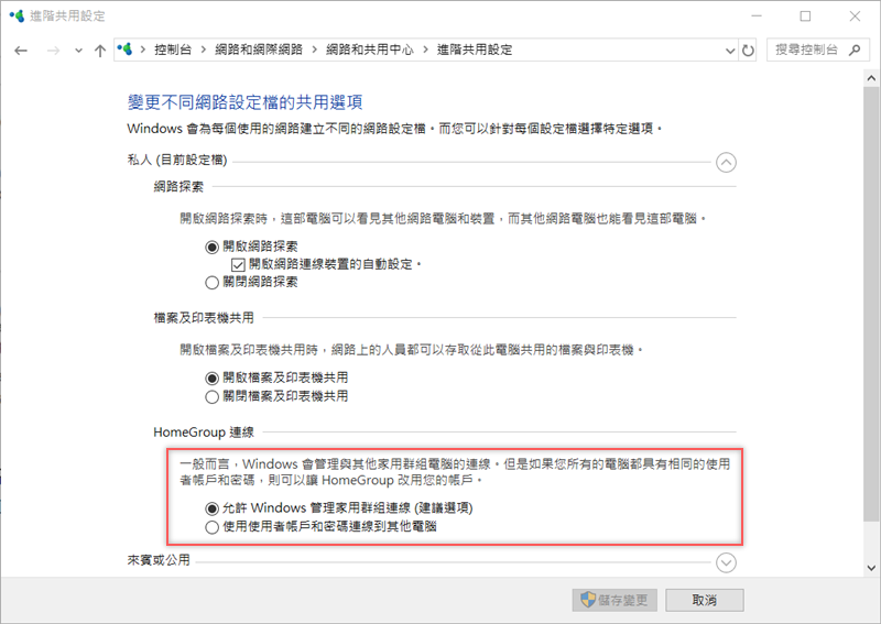 如果覺得不夠安全,可以進入進階共用設定,在 HomeGroup 連線中設定密碼。