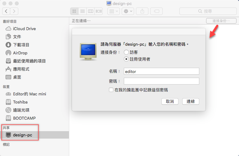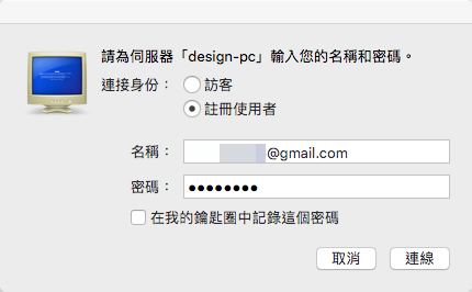 轉到 MacOS,從 Finder 左欄底下的共享,找到你的 Windows 電腦名稱,進入後點連接身分,輸入名稱及密碼。
