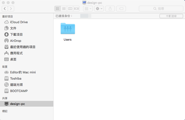 輸入後點連線就完成了,再進去 Users 找之前設定的資料夾即可,你可能會發現很多檔案和文件夾不知道什麼時候被設共用(或者預設就共用),自己也不知道。
