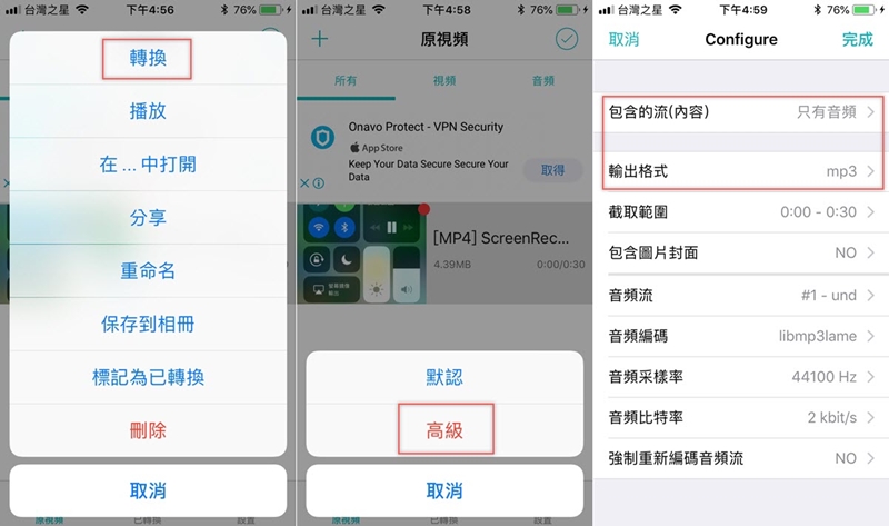 點縮圖後選擇轉換,進到高級項目後將內容設定「只有音頻」,輸出格式為 MP3。