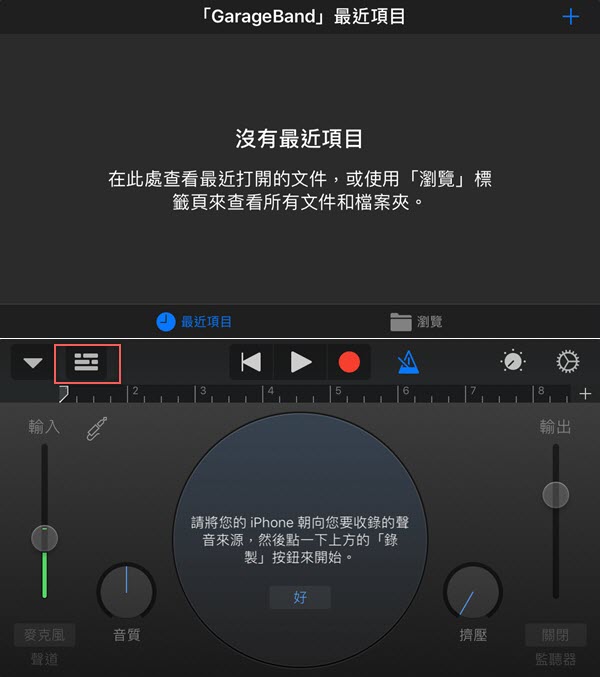 然後開啟 GarageBand 進到錄音機,在最近項目中按左上角圖示進入新頁面。