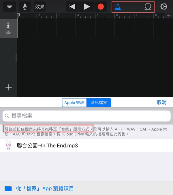 點藍色三角形將它變成白色後,再按圓形按鈕,搜尋到要使用的檔案並長按拖入音軌。