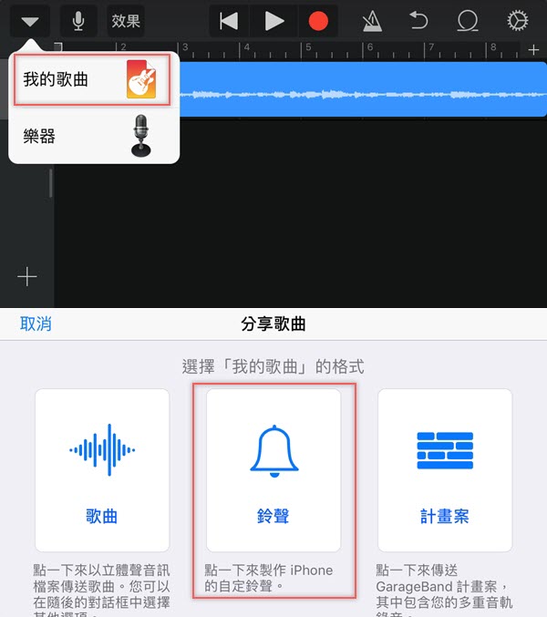 點開左上角選擇「我的歌曲」,會自動儲存檔案,再長按檔案分享到鈴聲即可。