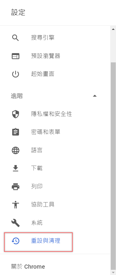 這個網頁也可以從設定區進入,按最底下的重設與清理。