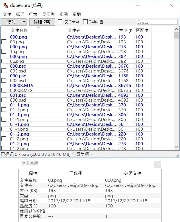 掃描時間依檔案內容而定,阿湯兩萬多個檔案大概花了三分鐘吧,因為很多檔名是相同的,所以沒意外搜出來的結果多達五百多項,可以點進去看編輯日期、匹配度、重複文件數等細節,也能保存成 Excel 檔方便日後查看。