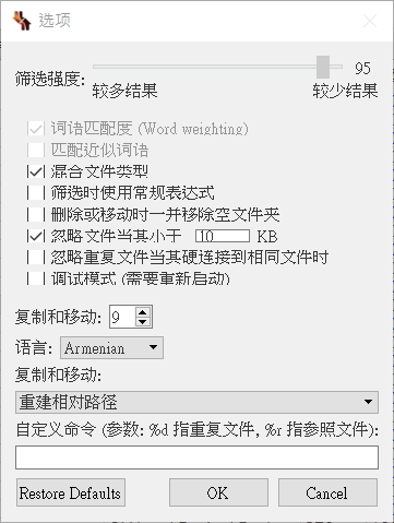 選項這裡可以設定篩選時的相關細節,像是文件大小與類型、忽略模式,移動路徑,或輸入自定義命令等調整。