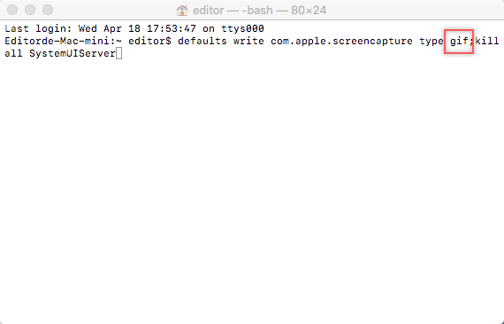 defaults write com.apple.screencapture type gif;killall SystemUIServer