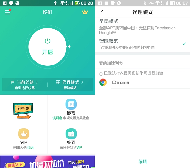 阿湯是用手機做示範,如果沒有要升級 VIP 就不用登錄帳號,先來看一下代理模式是什麼,原來是選擇要全部翻回中國還是部份,那當然是部分啊不然沒辦法上臉書,有需求的話也能編輯加速列表。