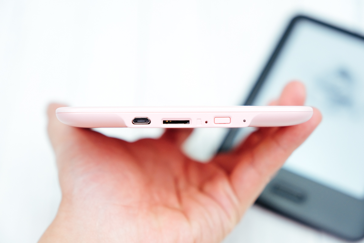 再來是底部的電源/待機鍵,充電則是透過 microUSB,另外提供有 microSD 卡槽可以自行額外匯入電子書來使用。