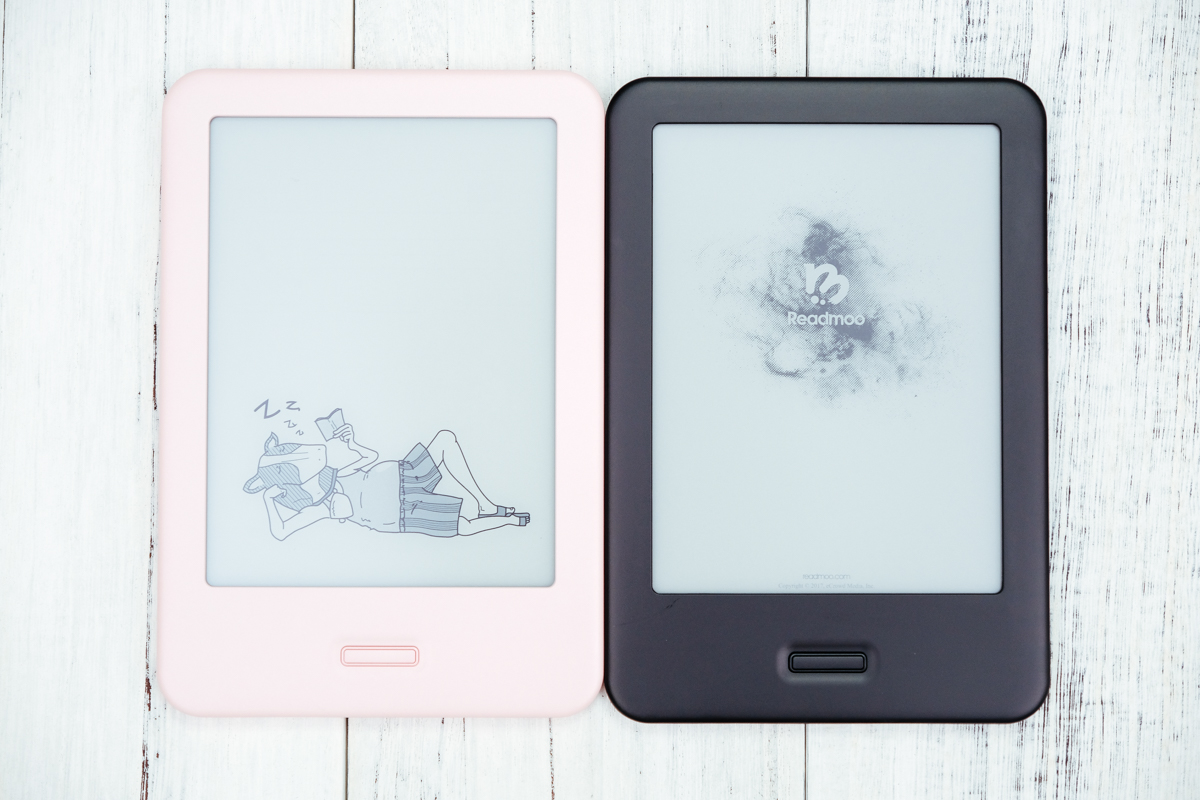 mooInk 一共有二種顏色,分別是緋櫻粉跟經典黑,而現在看到的畫面左邊是待機時顯示的圖樣,右邊則是關機時顯示的圖樣,特別是待機時的畫面也太好笑,挺著大肚子睡著拿著書。