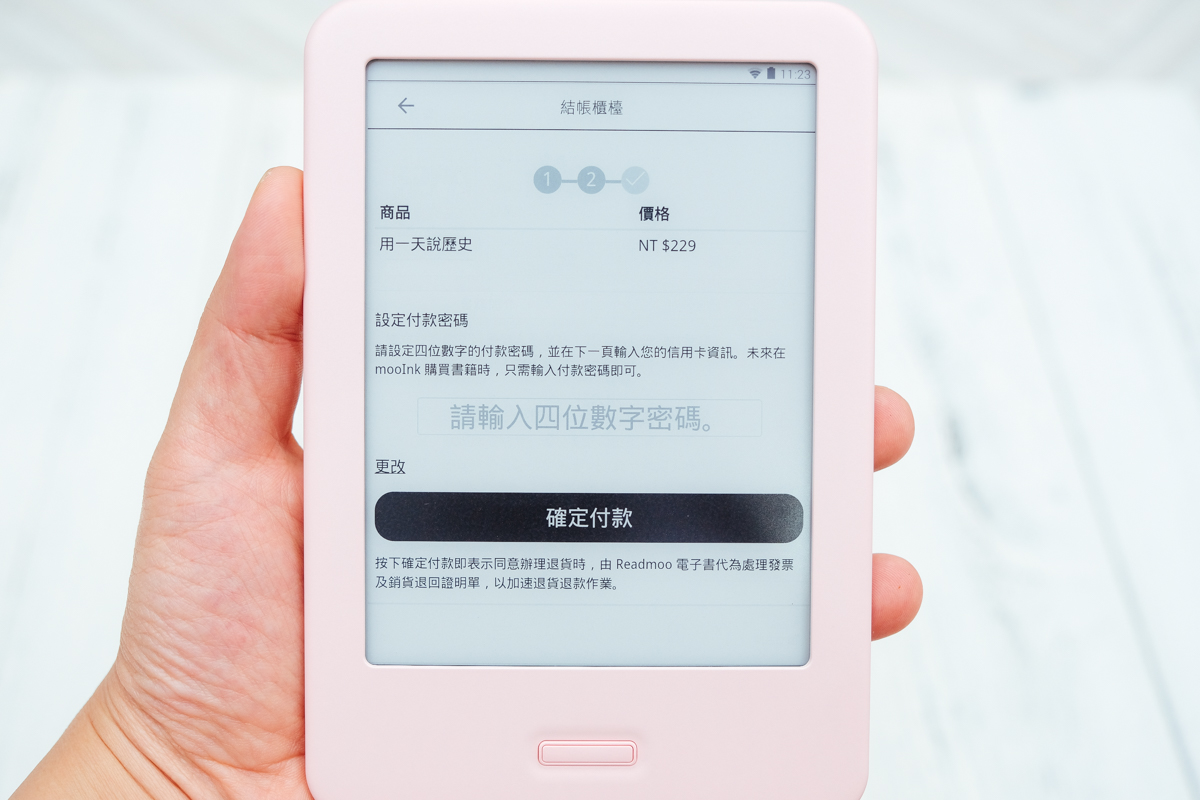 購買時是透過信用卡結帳,並設定一組付款密碼,第一次結帳完成後,未來就只需要再輸入付款密碼就可以了,買書流程很方便。