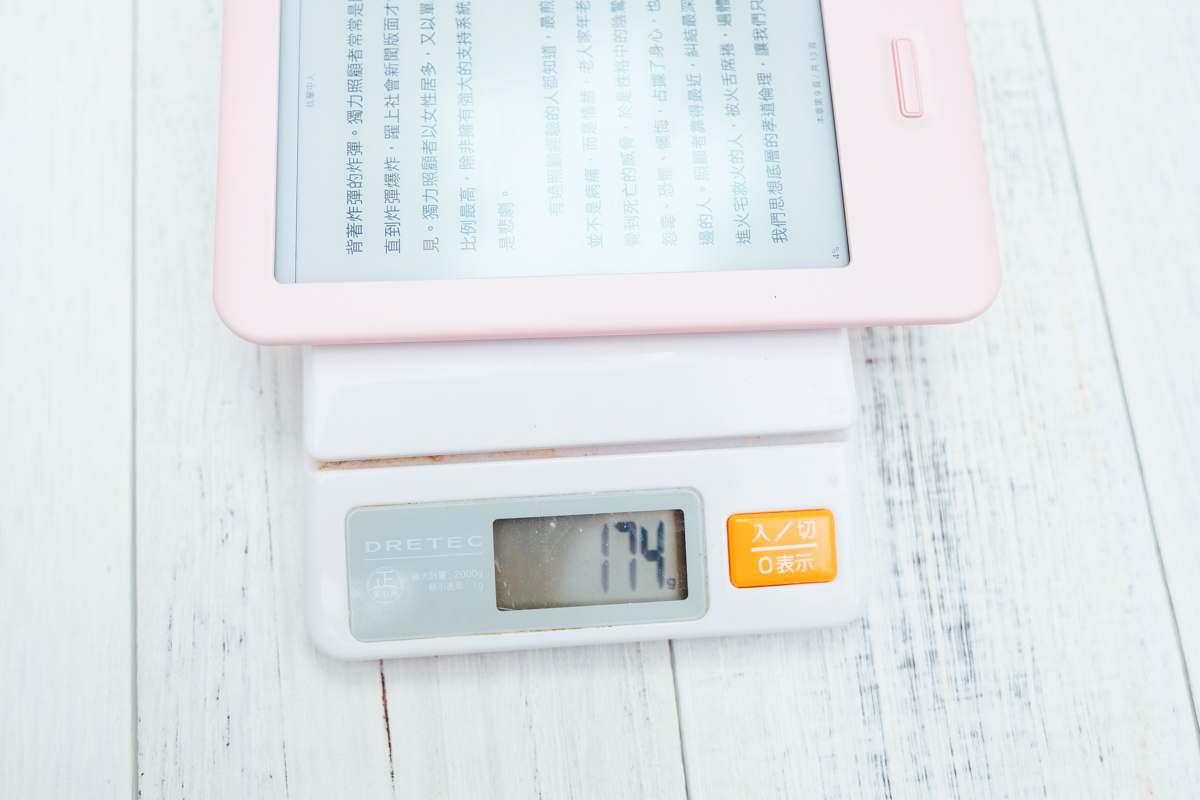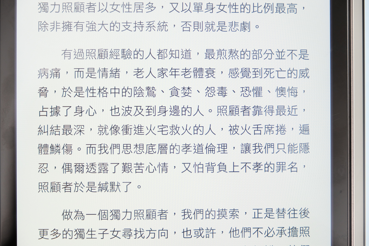 TM 電子紙顯示螢幕 + 紅外線式觸控 1072 x 1448 (300dpi) , 16 灰階),是採用電子紙顯示螢幕,所以不會有在看著光的感覺,也就更像是在看著紙本書,而沒有背光的缺點就是,當光線全關掉時,你一個字也就都看不到了。
