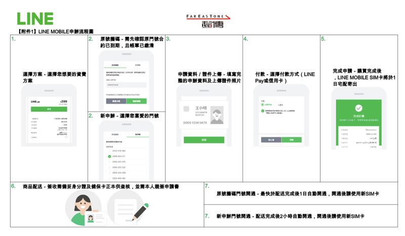 選擇方案 - 原門號攜碼 (確認帳單原門號已繳清) 或 選擇喜歡的新門號 - 申請資料 / 證件上傳 - 選擇 LINE Pay 或信用卡付款 - 完成申請。