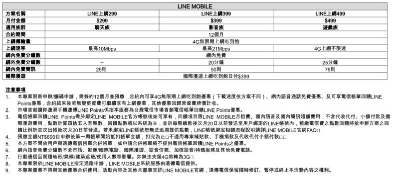 為了滿足各種不同生活型態的 LINE 用戶,LINE Mobile 設計了「聊天族」、「影音族」、「遊戲族」三種不同的資費,三者皆擁有上網吃到飽不降速、12 個月合約、國際漫遊上網每天 $399 元特色。