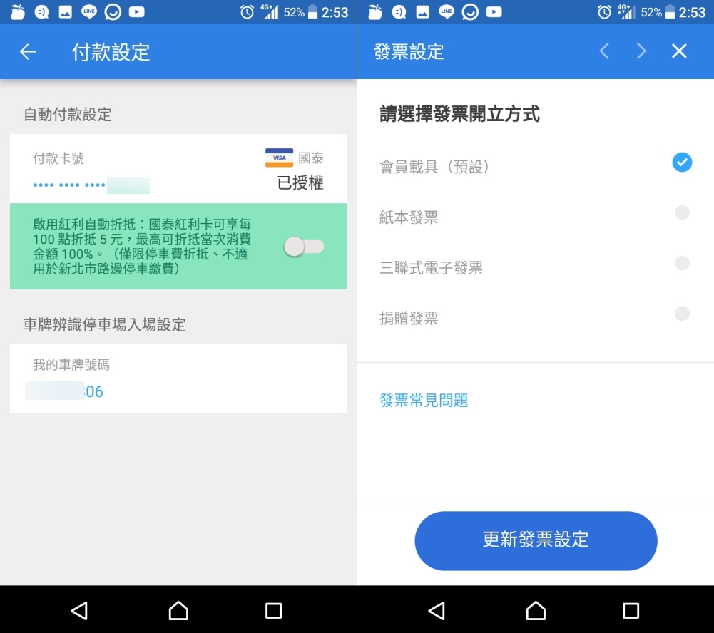 付款設定的部份要綁定信用卡及車牌,信用卡在輸入時也會讓你知道是否有優惠或紅利折抵的方式,發票也能選擇各種方式索取。