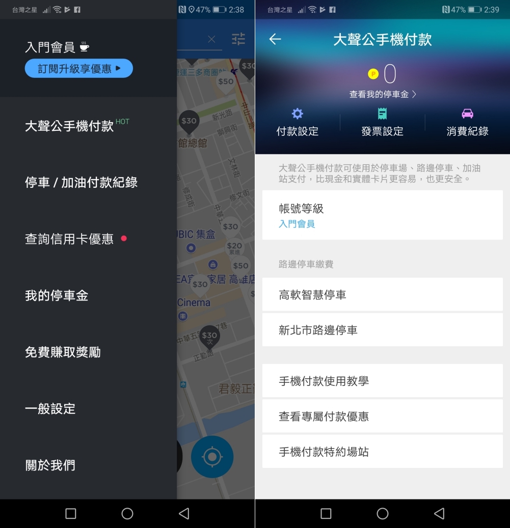 其實阿湯用停車大聲公雖然已經很久,但從來沒注意過每次更新的內容,因為我都是找車位、導航這樣而已,沒想到打開選單後發現功能變多了,如果要綁定自動扣繳,可以打開選單後有個「大聲公手機付款」,就可以綁定信用卡、設定發票資訊跟查看消費記錄。
