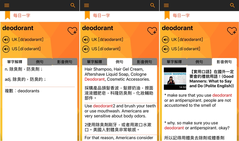 雖說如果只是要看懂網頁用 Google 翻譯就好,但身為學生手機裡怎麼可以沒有字典類 APP 呢,就算不是英文系也是有不少原文書需要查單字,如果在查詢的過程中順便學起來就更好了,這款 APP 特別的是除了一般解釋與例句,還有相關的影音例句,可以幫助學習。