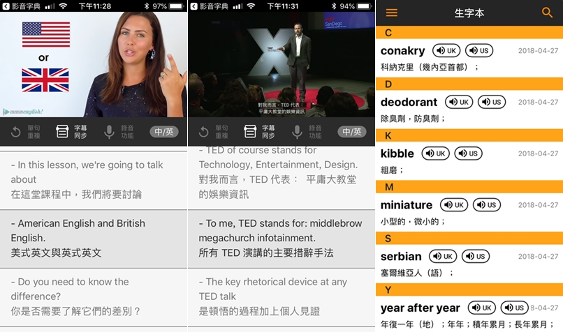 連續查了好幾個單字,都找得到來自 TED 或英語相關的 YouTube 影片,也能將不會的單字加入生字本來隨時複習,對了,要啟用影音功能的話需要連 VoiceTube 的主 APP 一起下載,這是一款蠻適合生活中學英文的工具,更多介紹請看