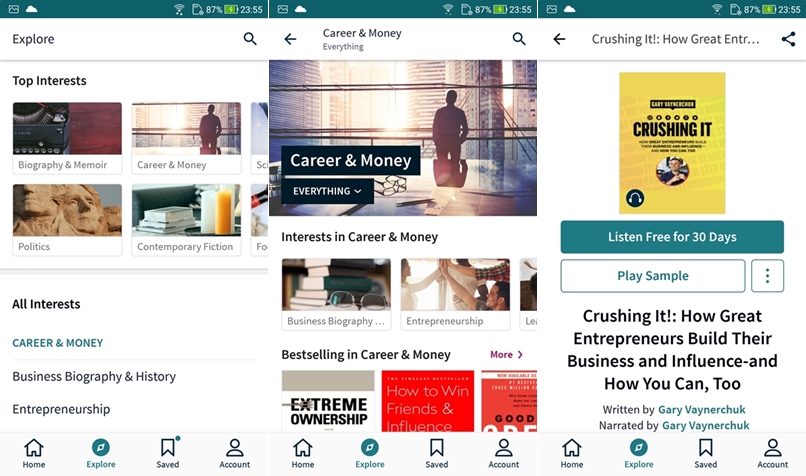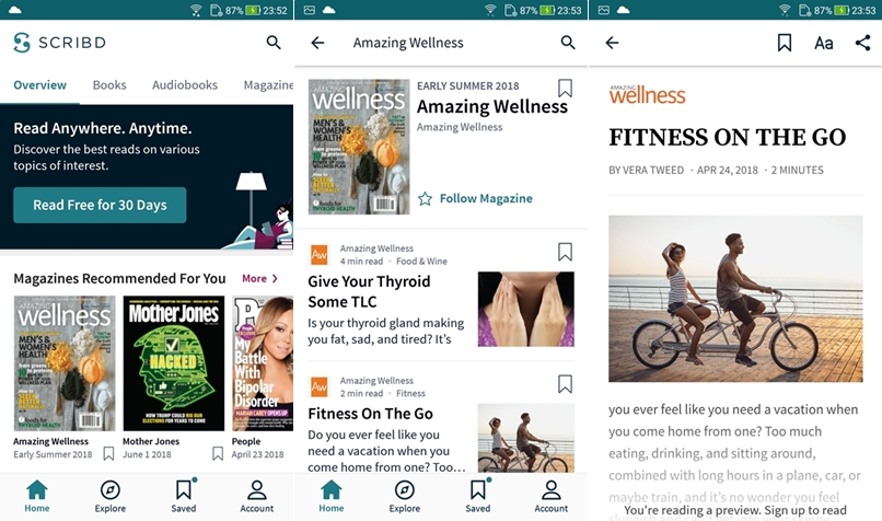不管是財務、政治、設計、健康等主題類別都可以在期限內無限閱讀,介面設計也很清晰,不過有個缺點就是,要免費繼續看下去的話要登記信用卡來取得 30 天授權,並自己留意日期不然會自動續訂,不過可以先存起來離線閱讀以及多設備同步功能還不錯,大家可以考慮看看。