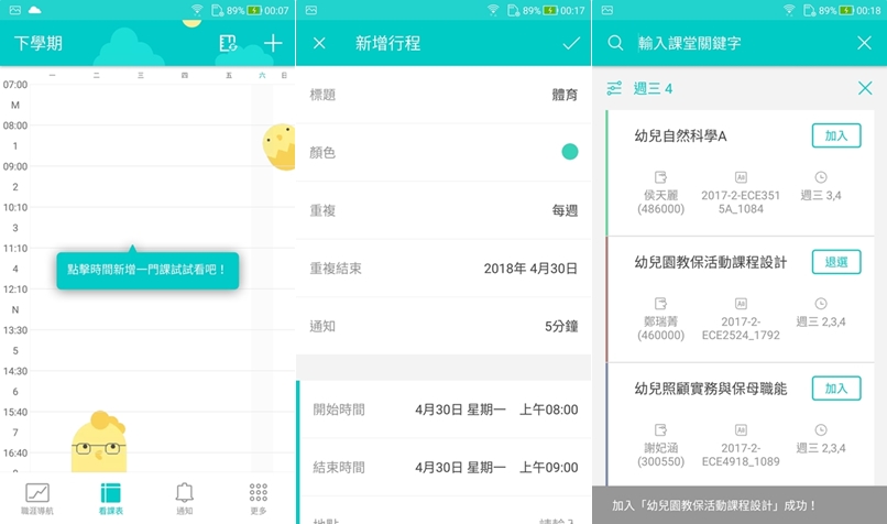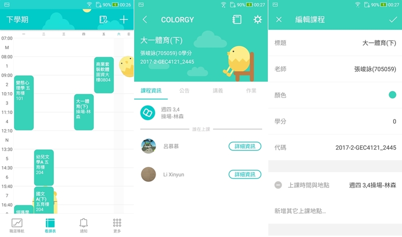 阿湯就這樣加入了好幾門課程,點進去都會有授課教師、地點、學分等資訊,還能知道有誰也選了同門課,去打個招呼搞不好是認識的也說不定,課程細節也能自行編輯,改個顏色或附註內容。