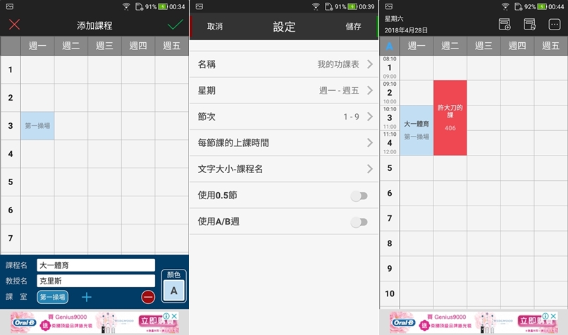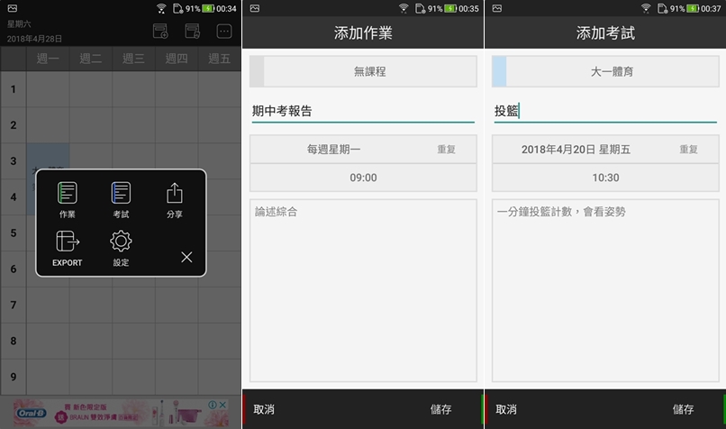 作業和考試內容也能一項項加進去,再設定時間提醒你別忘了,算是簡單又便利的課表管理程式。